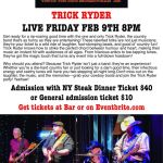 Trick Ryder – Live Country Night at Rednex Bar & Grill! Real Country for Western Dance Lovers! Date: Friday, Feb 9th, Dinner 6:30 PM, Band 8:00 PM Location: Rednex Bar & Grill, Morinville Dinner & Dance Special – $40 with Advance Ticket: 8 oz NY Steak & Fries – Caesar Side Salad General Admission (No [ Read More ]